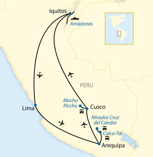 Auf dieser Reise erwarten Sie unvergessliche Einblicke in die faszinierende Kultur Perus und die Wunder seiner Natur! Über Arequipa am Fuße des Vulkans Misti geht es zunächst in das mächtige Colca-Tal, das nicht nur mit seinen charmanten Dörfern beeindruckt, sondern auch mit der seltenen Chance, den Flug des majestätischen Kondors zu beobachten. Anschließend besuchen Sie Cusco, die ehemalige Hauptstadt des Inka-Reiches. In keiner anderen Stadt können Sie die Mischung aus indigenem und kolonialem Baustil in so faszinierender Weise erleben. Mit Machu Picchu erwartet Sie eine der wohl berühmtesten und faszinierendsten archäologischen Stätten der Welt. Ein Ort, der bis heute voller unerklärlicher Mysterien steckt. Zum krönenden Abschluss Ihrer fantastischen Reise zeigt sich Peru von einer ganz ursprünglichen Seite. An Bord der komfortablen La Perla entdecken Sie ein Paradies für Naturliebhaber in einem der abgelegensten Regenwaldgebiete Südamerikas: Das Naturschutzgebiet Pacaya Samiria ist Heimat unzähliger Tier- und Pflanzenarten. Wo der Amazonas beginnt, startet Ihre Flusskreuzfahrt!